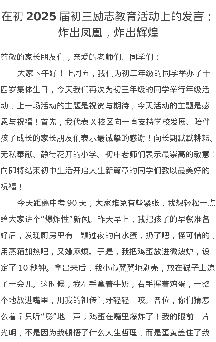 在初2025届初三励志教育活动上的发言:炸出凤凰,炸出辉煌