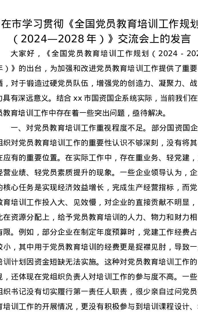 在市学习贯彻《全国党员教育培训工作规划(2024—2028年)》交流会上的发言