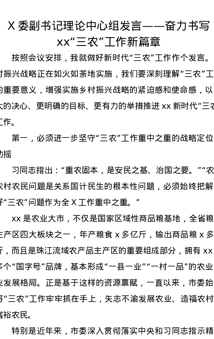 党委副书记理论中心组发言——奋力书写xx“三农”工作新篇章
