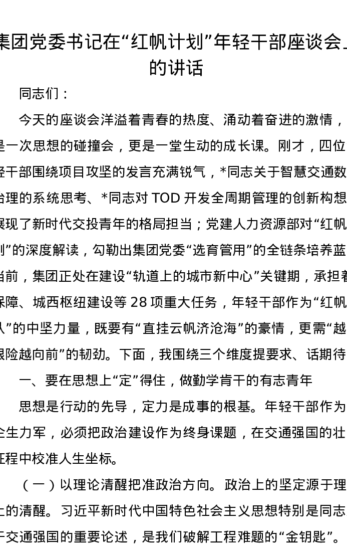 集团党委书记在“红帆计划”年轻干部座谈会上的讲话