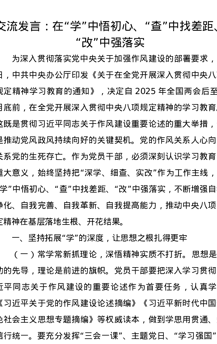 交流发言:在“学”中悟初心、“查”中找差距、“改”中强落实