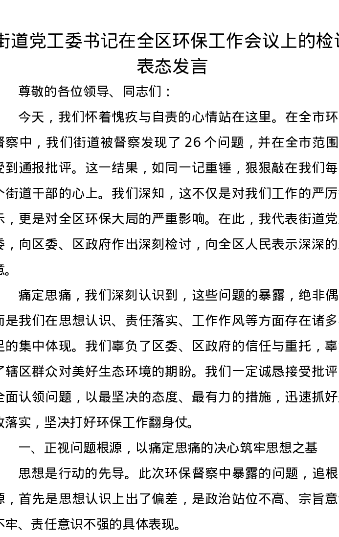 街道党工委书记在全区环保工作会议上的检讨表态发言