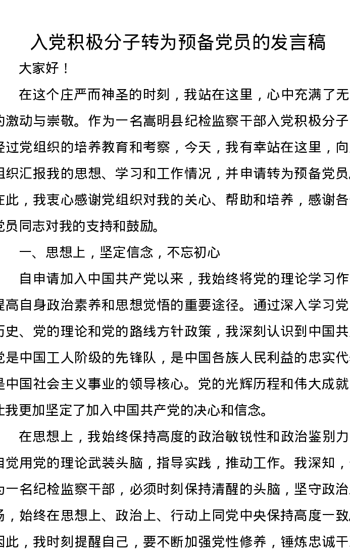 入党积极分子转为预备党员的发言稿