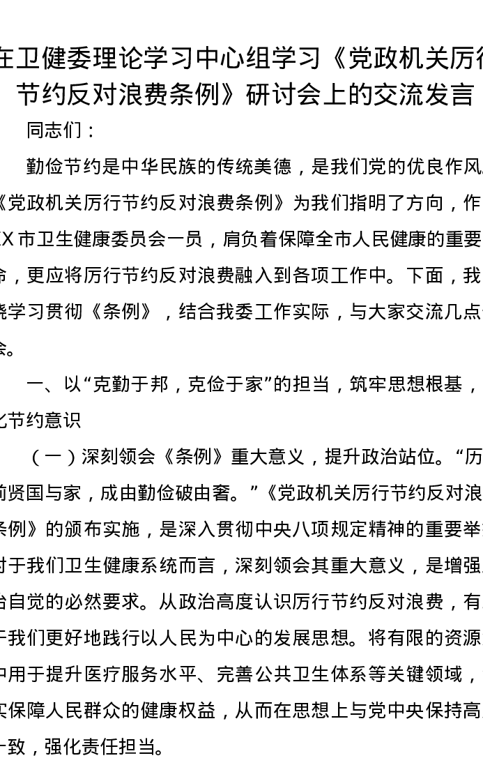 在卫健委理论学习中心组学习《党政机关厉行节约反对浪费条例》研讨会上的交流发言