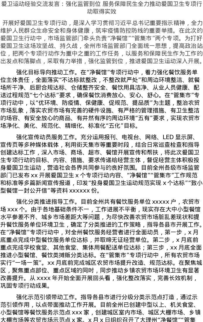 20220222爱卫运动经验交流发言:强化监管到位 服务保障民生全力推动爱国卫生专项行动取得实效