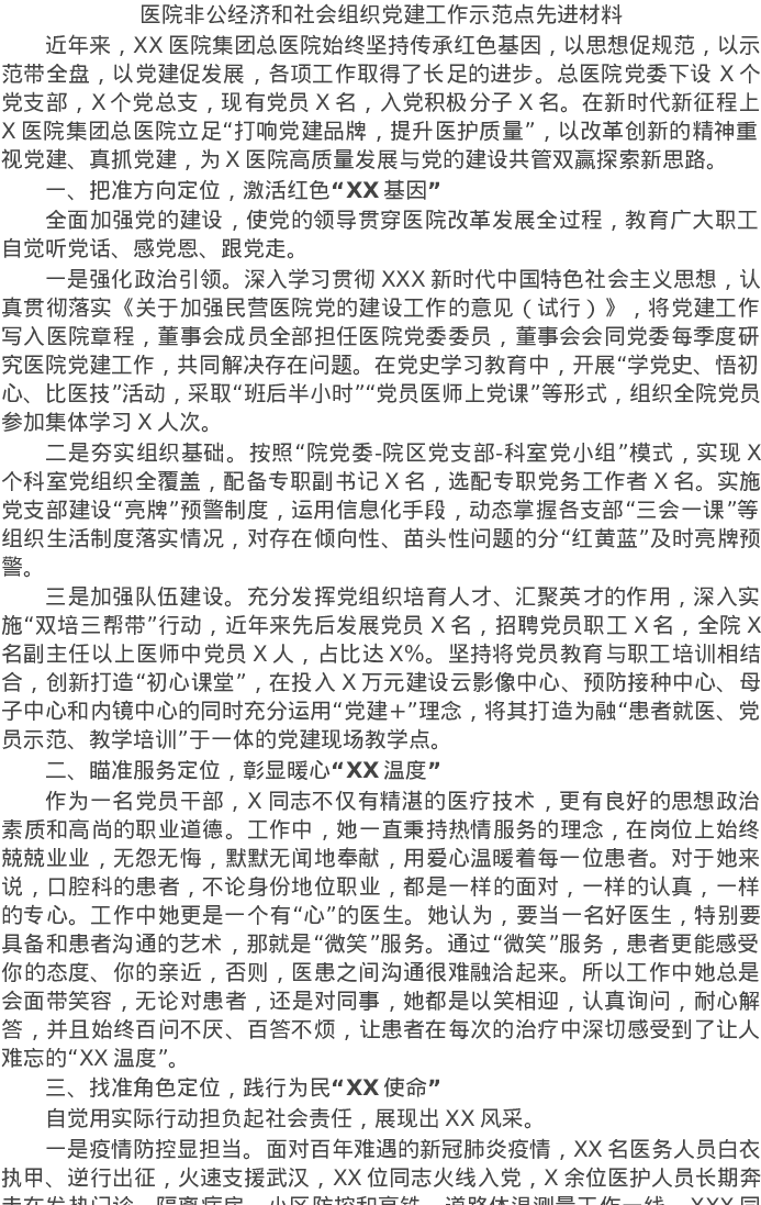 20220322医院非公经济和社会组织党建工作示范点先进材料