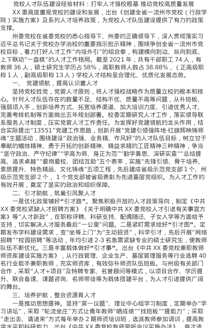 20220330党校人才队伍建设经验材料:打牢人才强校根基 推动党校高质量发展