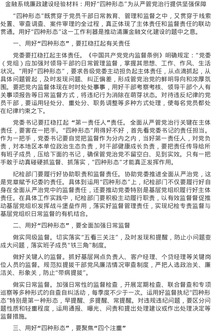 20220520金融系统廉政建设经验材料:用好“四种形态”为从严管党治行提供坚强保障