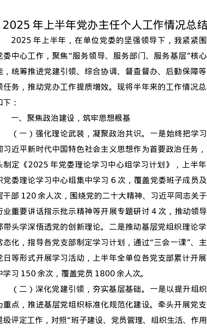 2025年上半年党办主任个人工作情况总结
