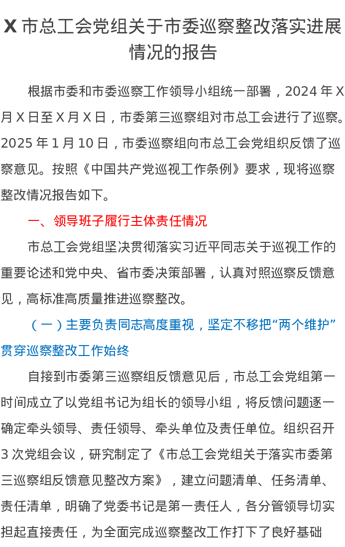 X市总工会党组关于市委巡察整改落实进展情况的报告
