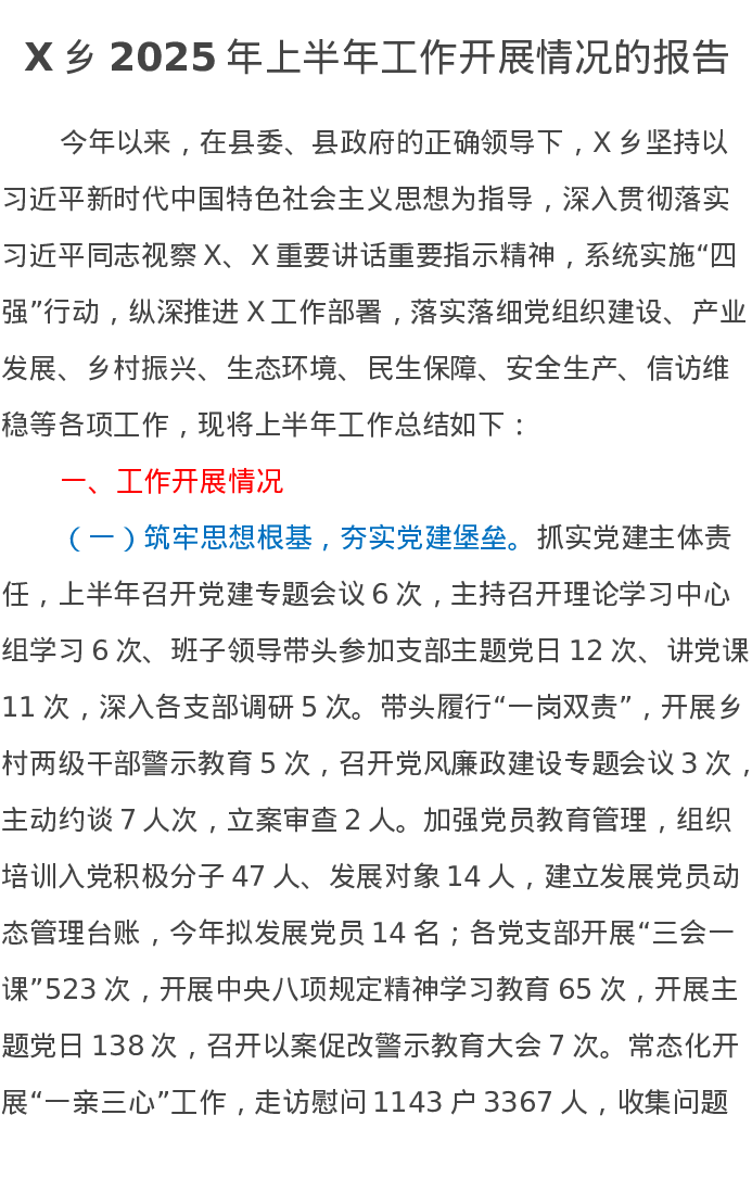X乡2025年上半年工作开展情况的报告