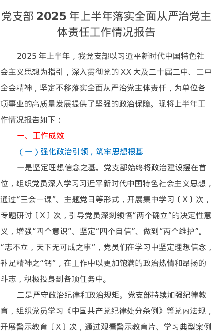 党支部2025年上半年落实全面从严治党主体责任工作情况报告