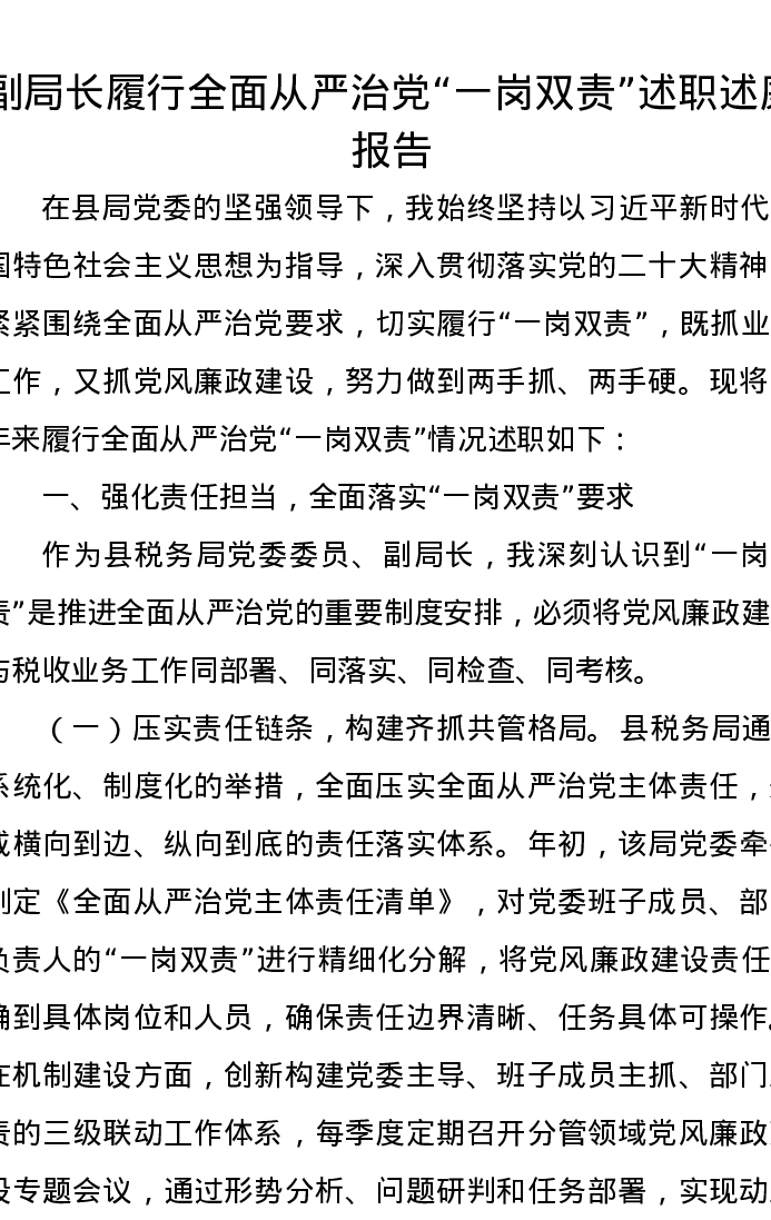 副局长履行全面从严治党“一岗双责”述职述廉报告