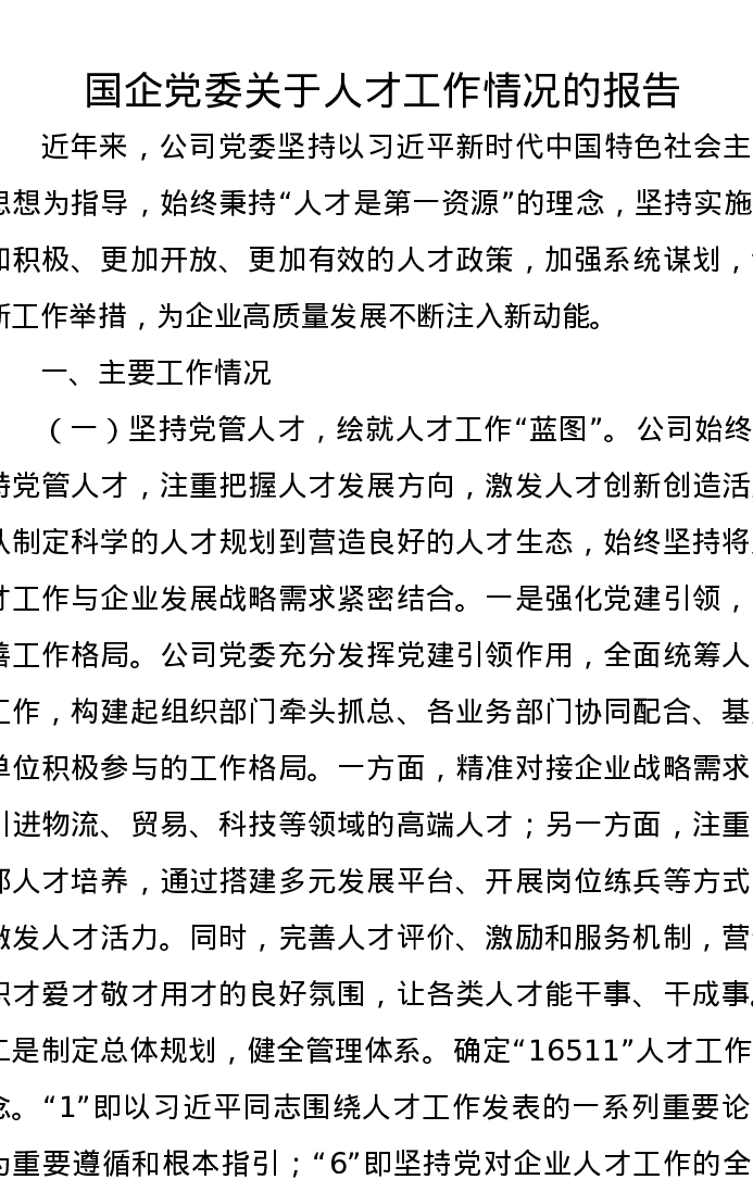 国企党委关于人才工作情况的报告