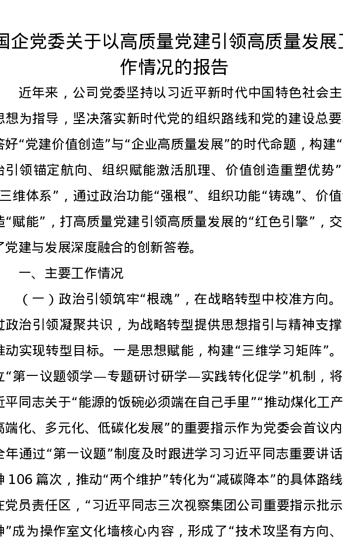 国企党委关于以高质量党建引领高质量发展工作情况的报告
