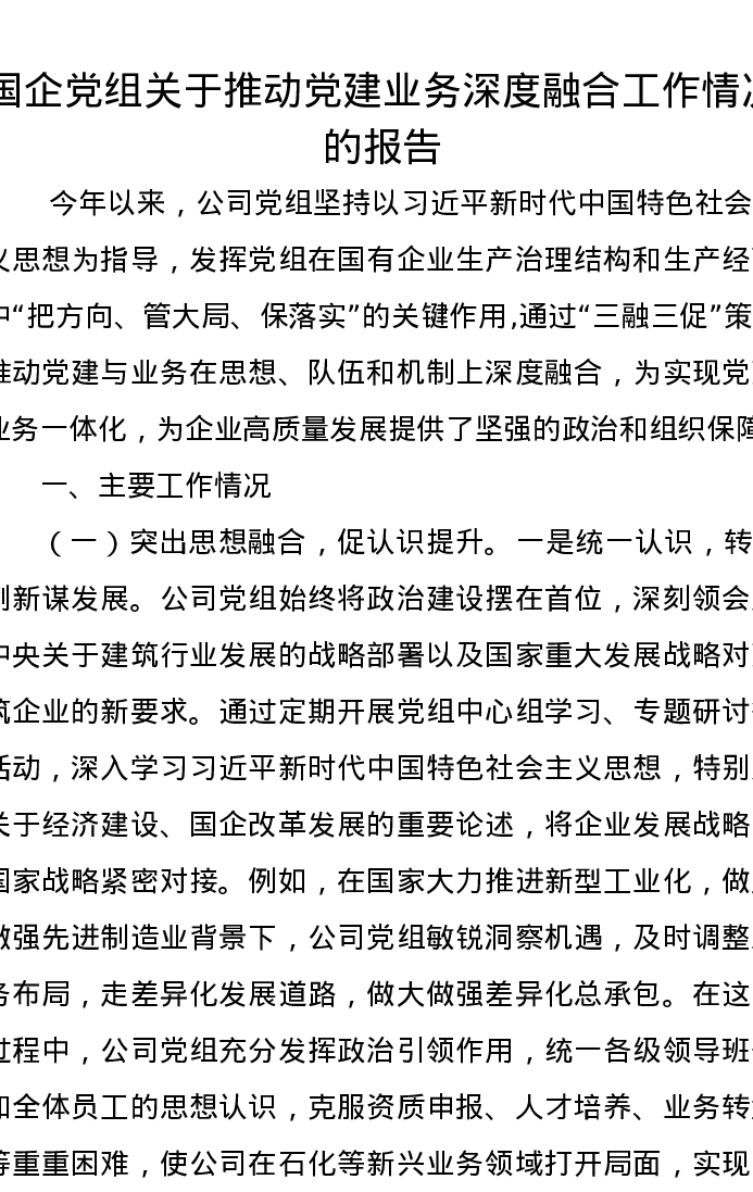 国企党组关于推动党建业务深度融合工作情况的报告