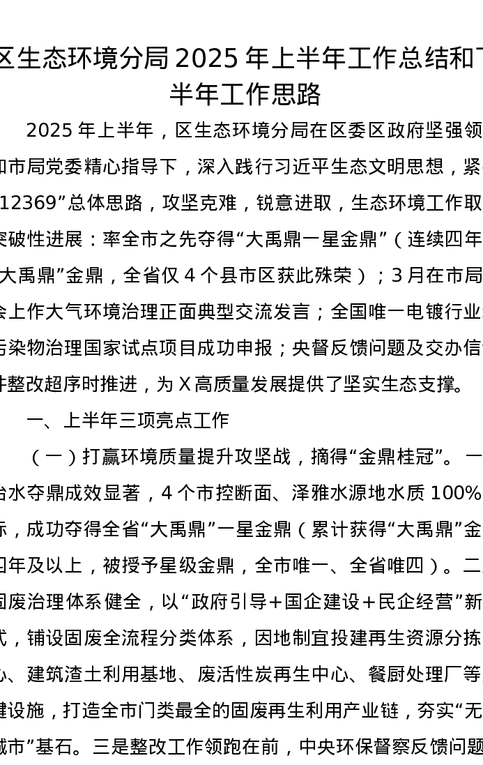 区生态环境分局2025年上半年工作总结和下半年工作思路