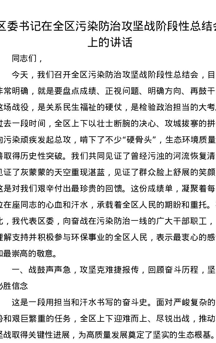 区委书记在全区污染防治攻坚战阶段性总结会上的讲话