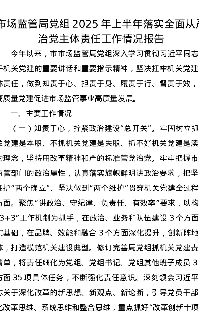 市场监管局党组2025年上半年落实全面从严治党主体责任工作情况报告