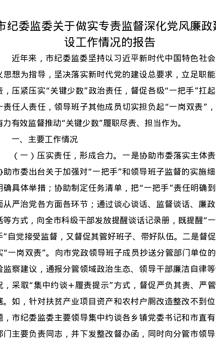 市纪委监委关于做实专责监督深化党风廉政建设工作情况的报告