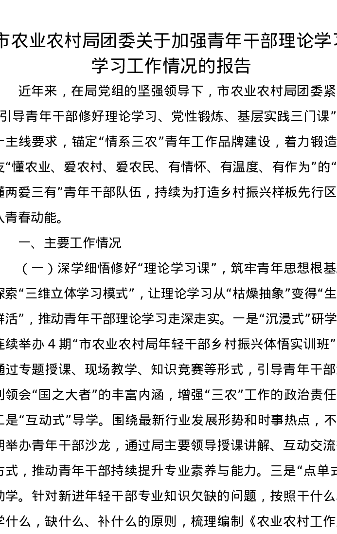 市农业农村局团委关于加强青年干部理论学习学习工作情况的报告