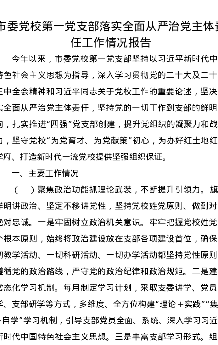市委党校第一党支部落实全面从严治党主体责任工作情况报告