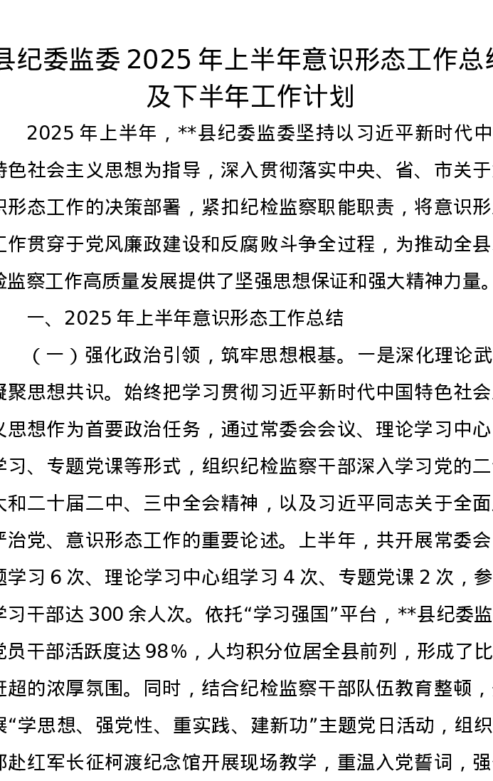 县纪委监委2025年上半年意识形态工作总结及下半年工作计划