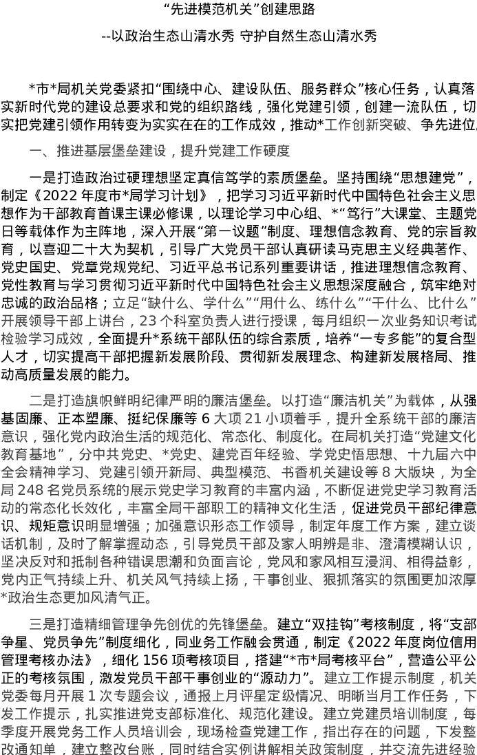 20220609“先进模范机关”创建思路--以政治生态山清水秀 守护自然生态山清水秀