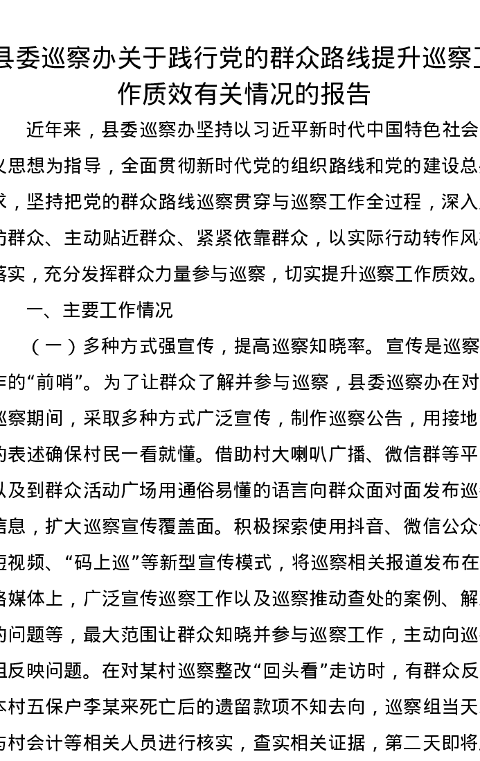 县委巡察办关于践行党的群众路线提升巡察工作质效有关情况报告