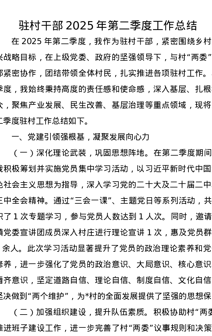 驻村干部2025年第二季度工作总结