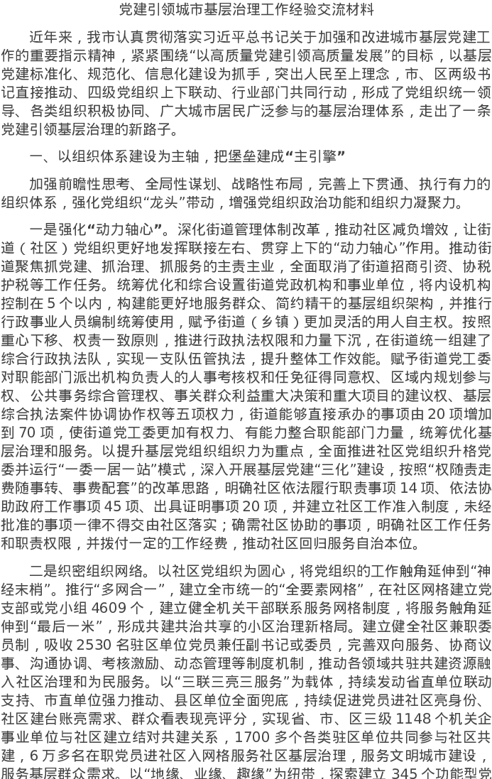20220610党建引领城市基层治理工作经验交流材料