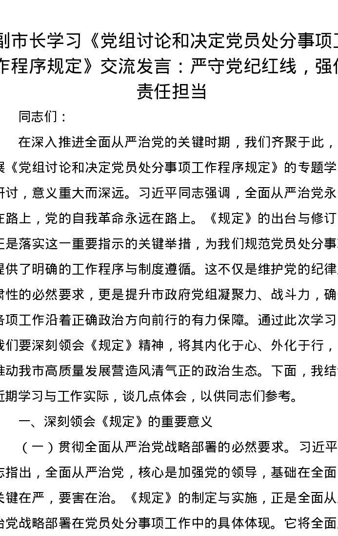 副市长学习《党组讨论和决定党员处分事项工作程序规定》交流发言:严守党纪红线,强化责任担当