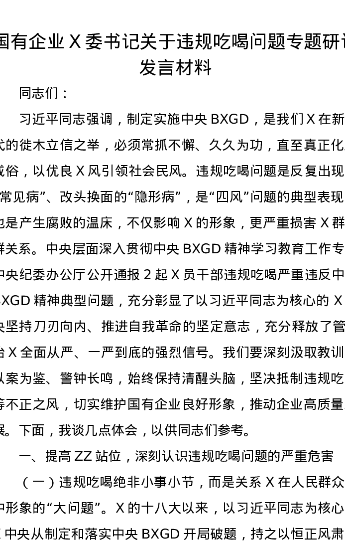 国有企业党委书记关于违规吃喝问题专题研讨发言材料