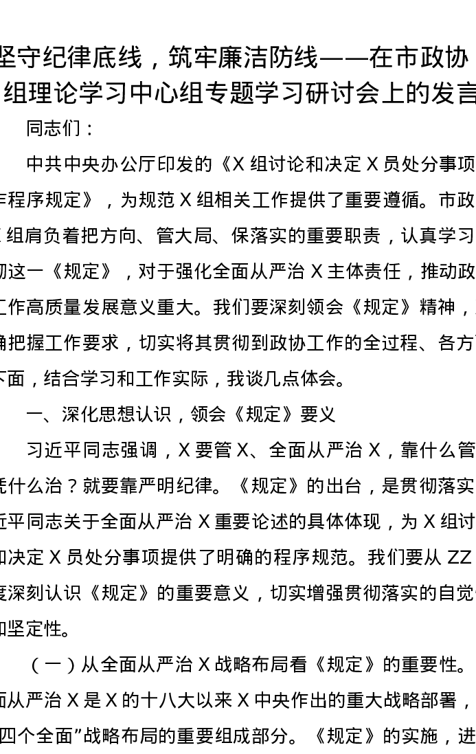 坚守纪律底线,筑牢廉洁防线——在市政协党组理论学习中心组专题学习研讨会上的发言