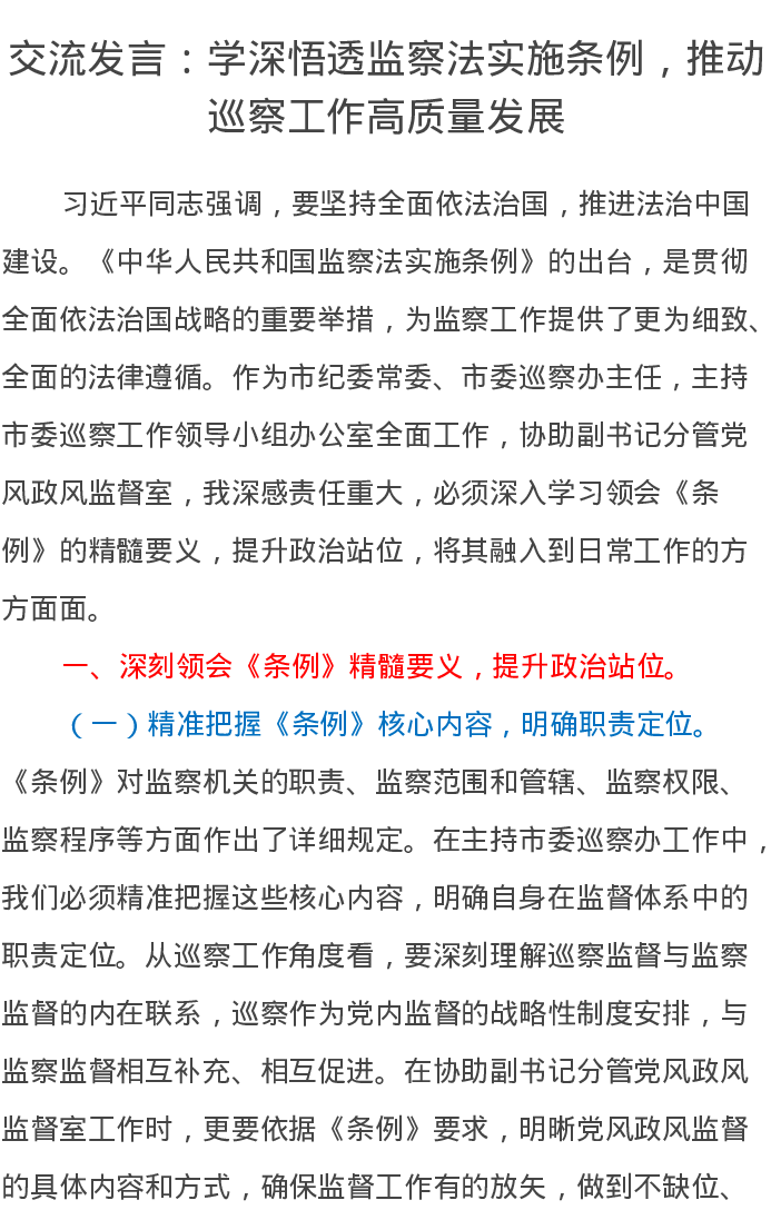 交流发言:学深悟透监察法实施条例,推动巡察工作高质量发展