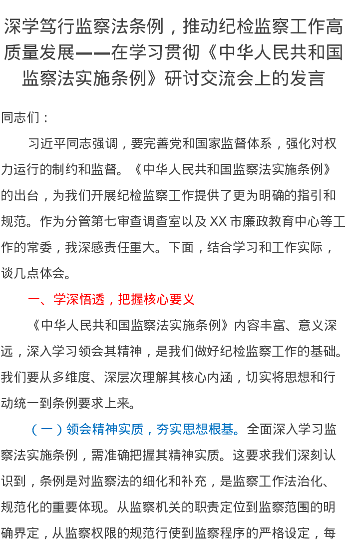 深学笃行监察法条例,推动纪检监察工作高质量发展——在学习贯彻《中华人民共和国监察法实施条例》研讨交流会上的发言