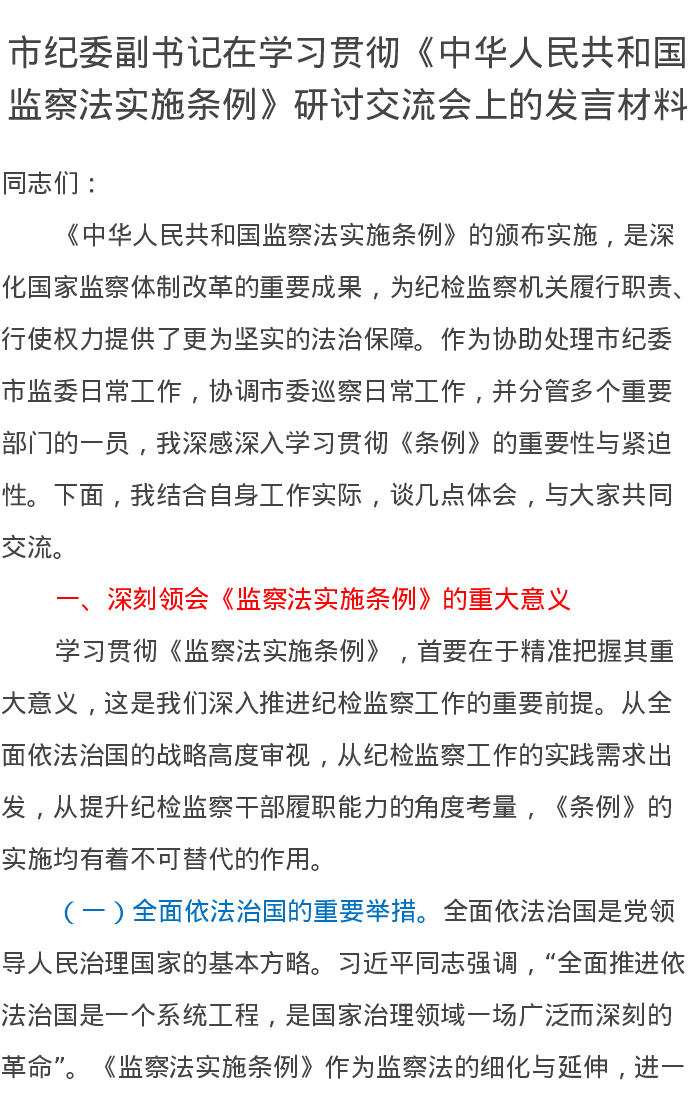市纪委副书记在学习贯彻《中华人民共和国监察法实施条例》研讨交流会上的发言材料