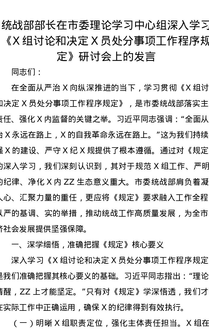 统战部部长在市委理论学习中心组深入学习《党组讨论和决定党员处分事项工作程序规定》研讨会上的发言