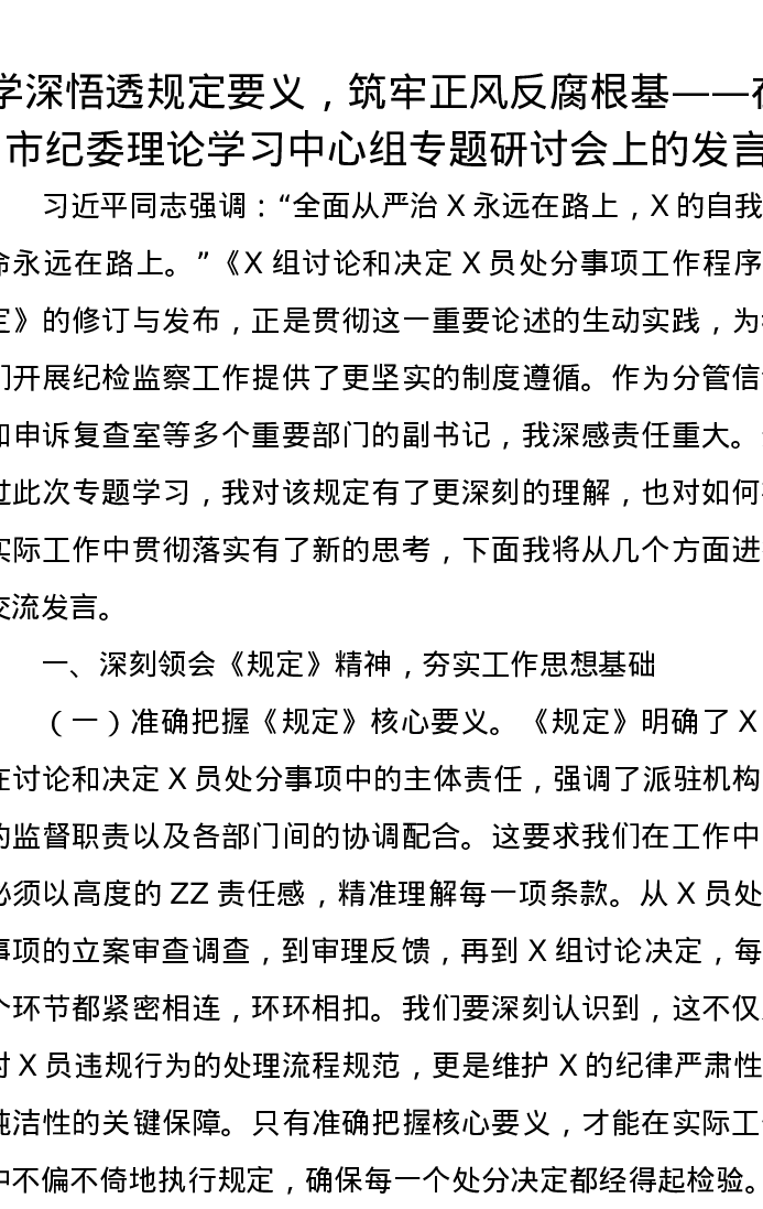 学深悟透《党组讨论和决定党员处分事项工作程序规定》要义,筑牢正风反腐根基——在市纪委理论学习中心组专题研讨会上的发言