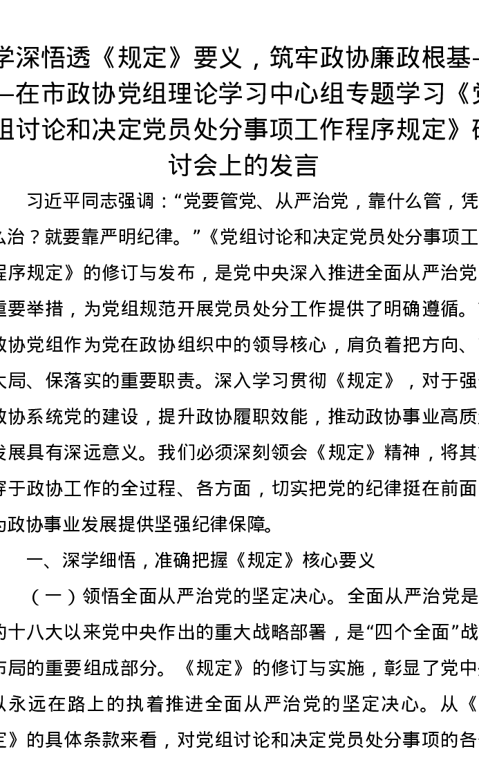 学深悟透《规定》要义,筑牢政协廉政根基——在市政协党组理论学习中心组专题学习《党组讨论和决定党员处分事项工作程序规定》研讨会上的发言