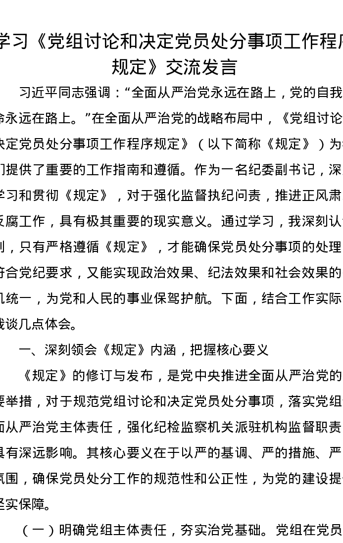学习《党组讨论和决定党员处分事项工作程序规定》交流发言