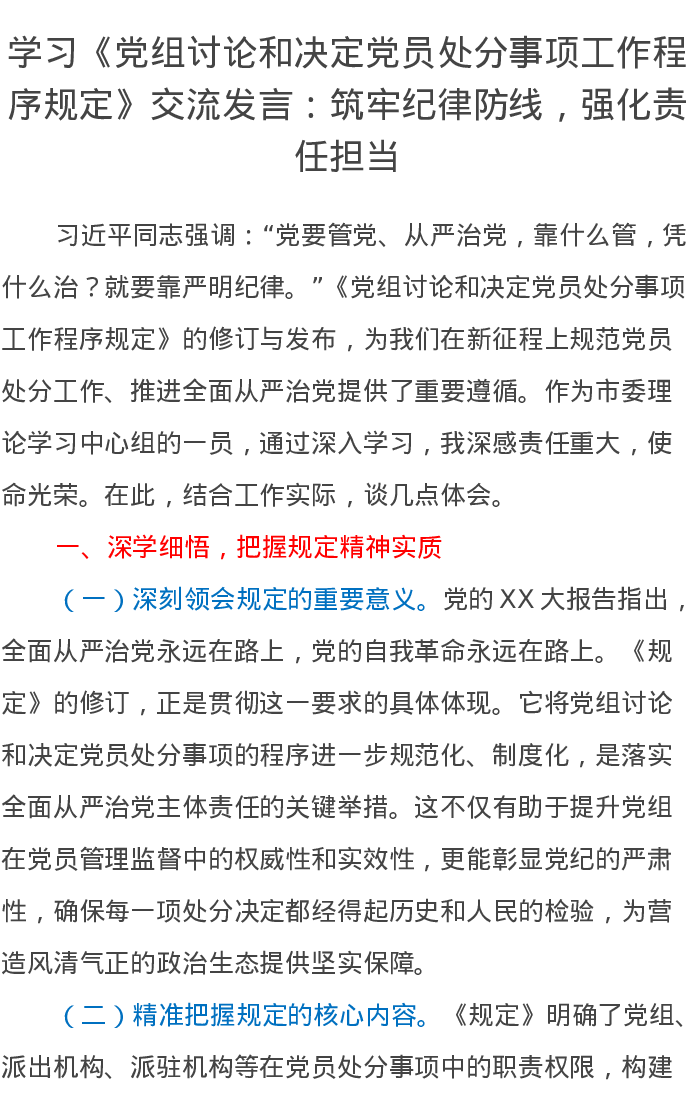 学习《党组讨论和决定党员处分事项工作程序规定》交流发言:筑牢纪律防线,强化责任担当