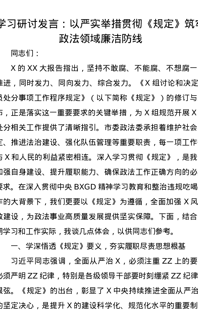 学习研讨发言:以严实举措贯彻《党组讨论和决定党员处分事项工作程序规定》筑牢政法领域廉洁防线