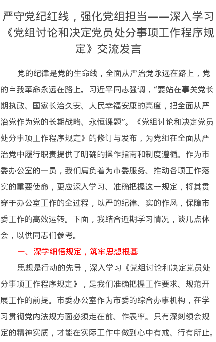 严守党纪红线,强化党组担当——深入学习《党组讨论和决定党员处分事项工作程序规定》交流发言