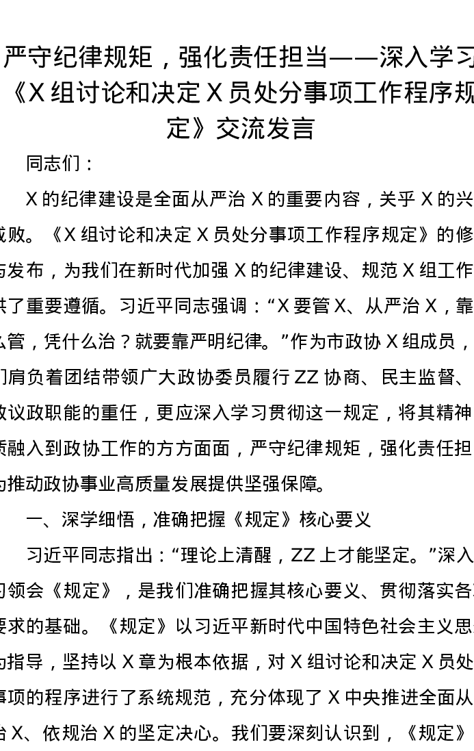 严守纪律规矩,强化责任担当——深入学习《党组讨论和决定党员处分事项工作程序规定》交流发言