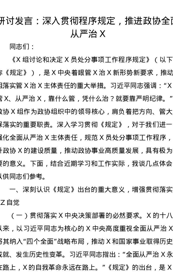 研讨发言:深入贯彻《党组讨论和决定党员处分事项工作程序规定》,推进政协全面从严治党