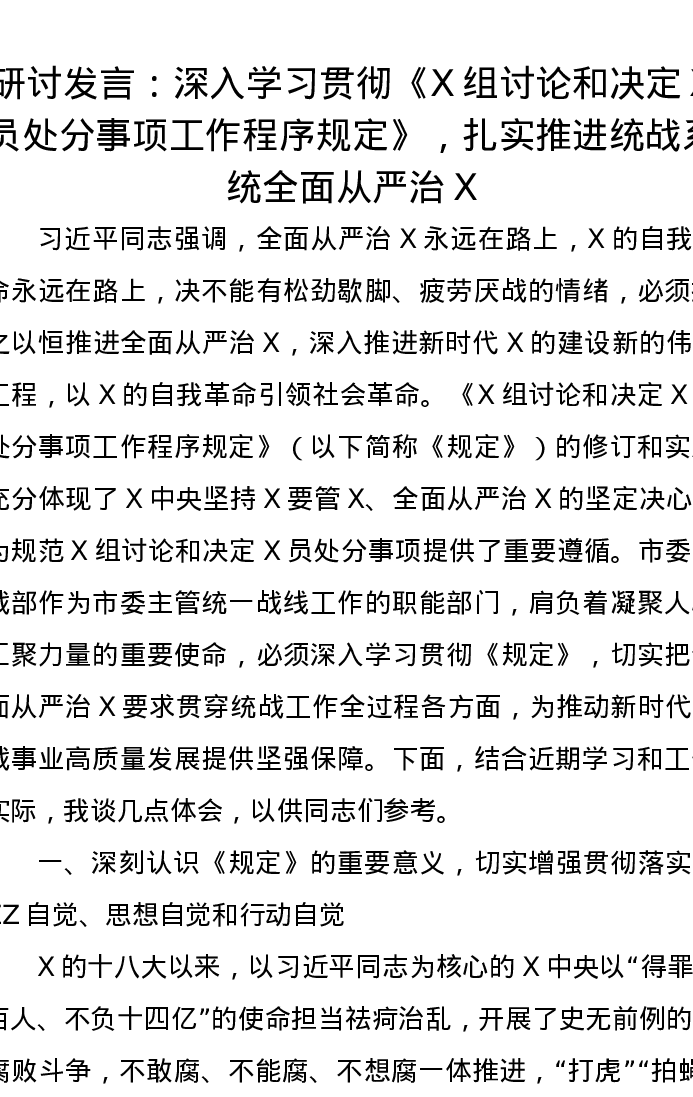 研讨发言:深入学习贯彻《党组讨论和决定党员处分事项工作程序规定》,扎实推进统战系统全面从严治党