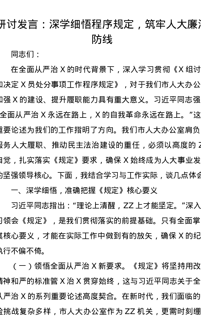 研讨发言:深学细悟《党组讨论和决定党员处分事项工作程序规定》,筑牢人大廉洁防线