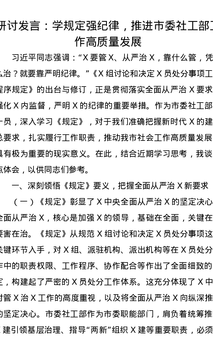 研讨发言:学规定强纪律,推进市委社工部工作高质量发展