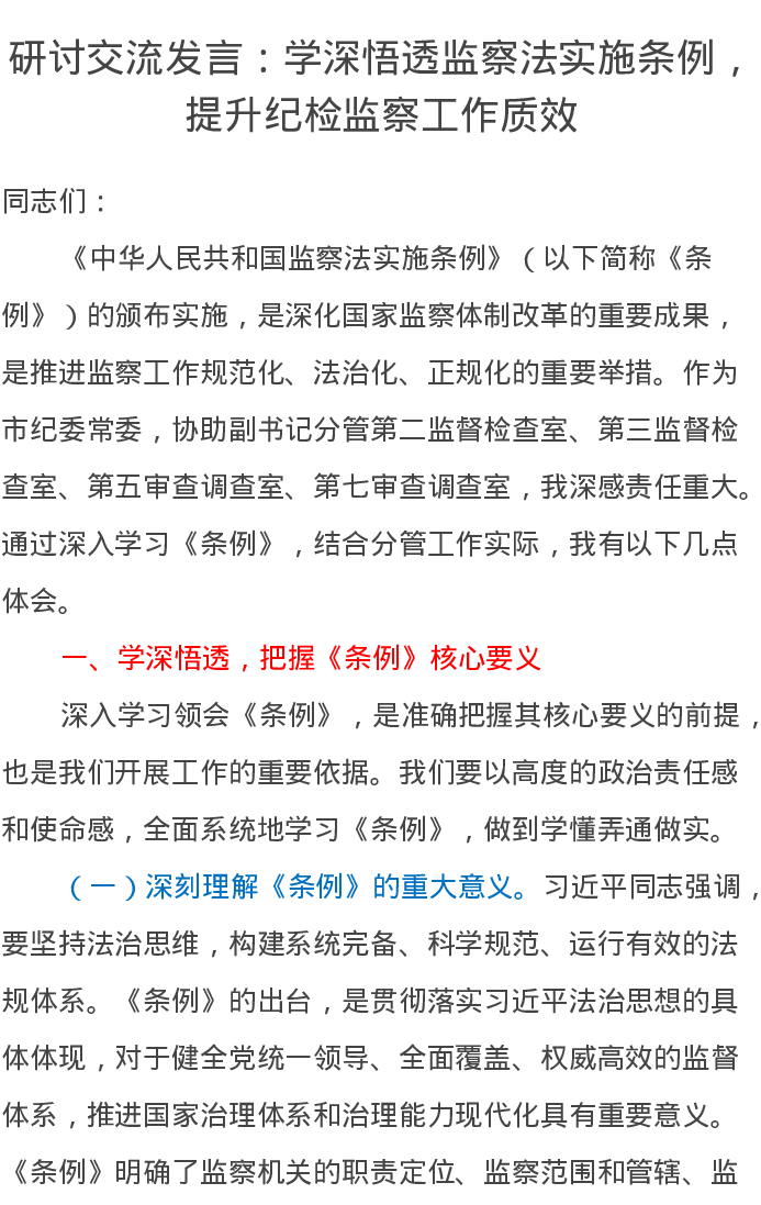 研讨交流发言:学深悟透监察法实施条例,提升纪检监察工作质效